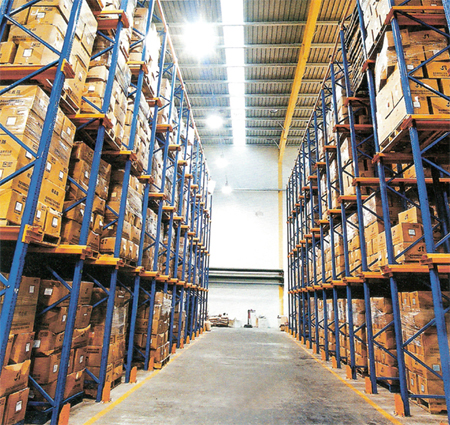 适用于存储量大,品种少的货物,叉车可直接进入货物通道存储货物,仓库利用率高。