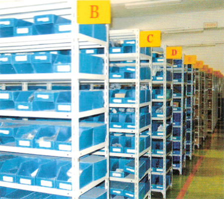 插接方式组装,安装拆卸方便,钢层板可以以50mm为单位上下任意调节,满足多种存放需求。货架由立柱、层板、角码、卡哨、专用螺栓和塑料底脚组成。